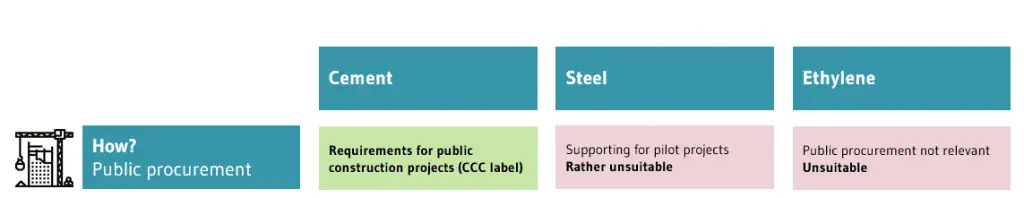 - For cement, due to the homogeneous value chain structure, requirements for public construction projects based on the CCC label of the industry sector are a viable option. The German government’s special fund for infrastructure and climate neutrality could secure the financing of public construction projects.