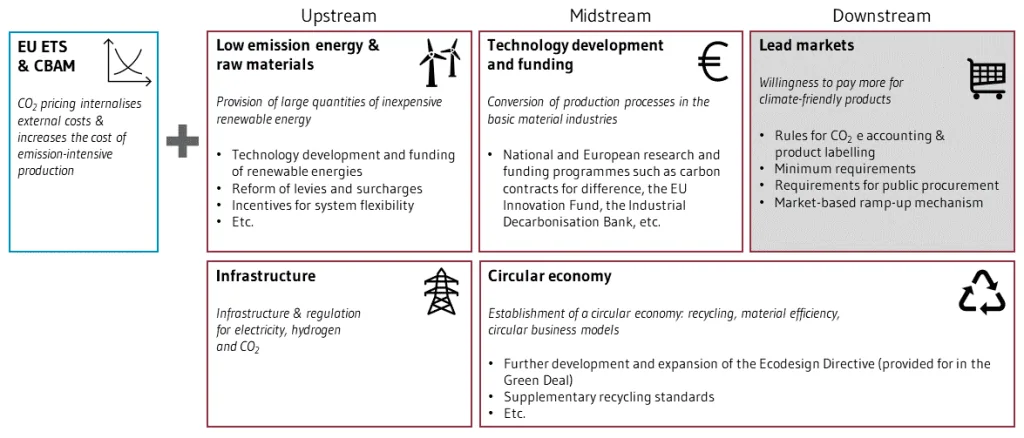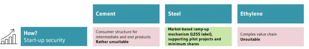 - Lead markets, more specifically corresponding demand-side instruments, should be designed specifically for particularly emission-intensive basic materials such as cement, steel and ethylene to effectively address the needs of the respective industry sector (see overview figure below).