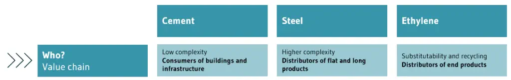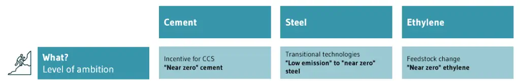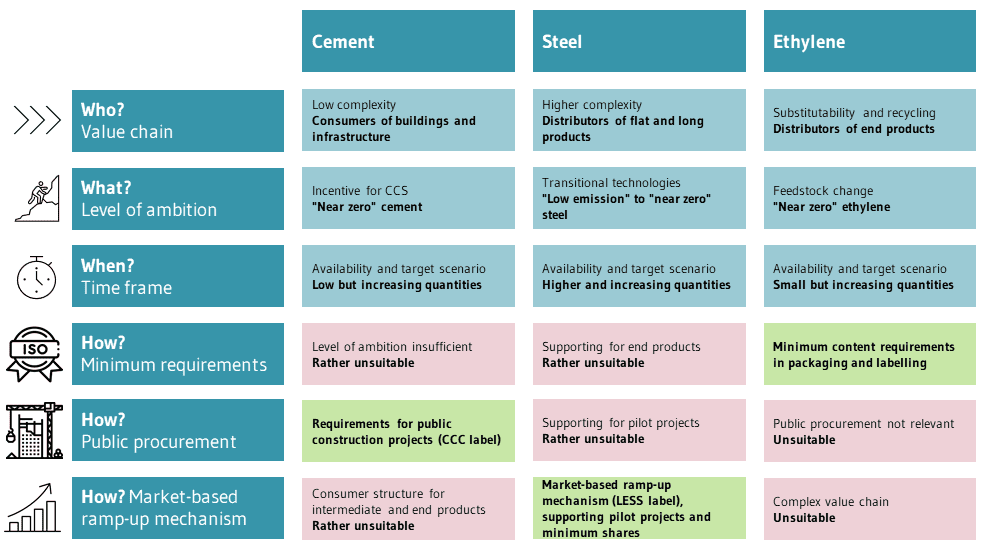 To establish the lead market instruments for climate-friendly cement, steel and ethylene, there are three design parameters, which will be assessed in detail (see table below).