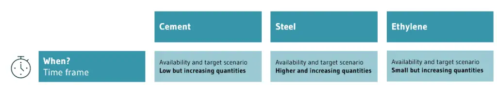 For example, only a small share of “near zero” cement can realistically be considered by 2030, as CCS will be necessary and has not yet been established. In the medium term, however, this share must increase significantly to ensure that the targets are achieved by 2045.