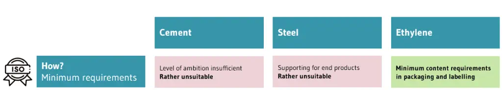 In the case of cement, it is questionable whether minimum requirements offer sufficient incentive for the transformation of the industry, as no ambitious minimum shares can be set in line with existing regulations (Construction Products Regulation, Energy Performance of Buildings Directive).