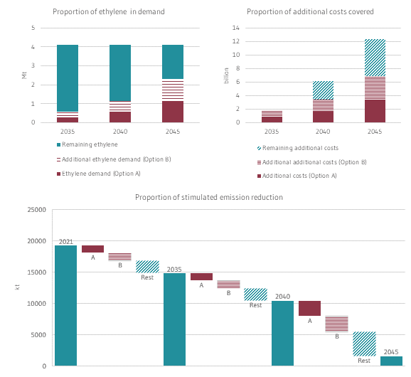 The figure below compares two options. Option A is less ambitious, while Option B is based on the Ariadne technology mix scenario. It is clear that, despite an incentive to transition to non-fossil feedstocks, further instruments are necessary.