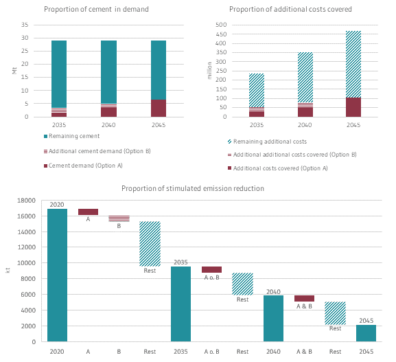 Figure 13 compares two options for cement. Option A assumes a non-linear increase in the proportion of “near zero” cement. Option B shows a linear increase. It is clear that public procurement can play a relevant role in the transformation of the cement industry, but that further instruments are necessary.