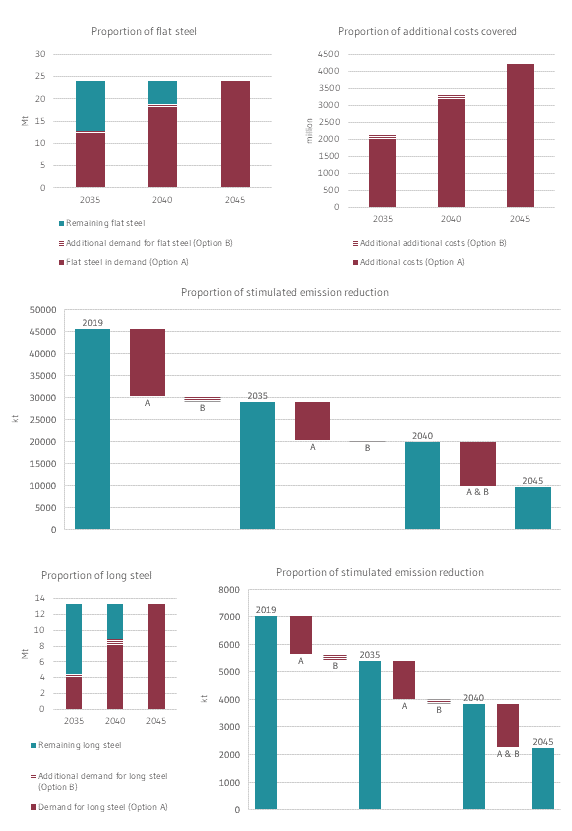 Figure 14 compares two options. Option A corresponds to process shares slightly below the Ariadne technology mix scenario, while option B corresponds to this scenario. It is clear that a market-based ramp-up mechanism can make a major contribution to the transformation of the steel industry.