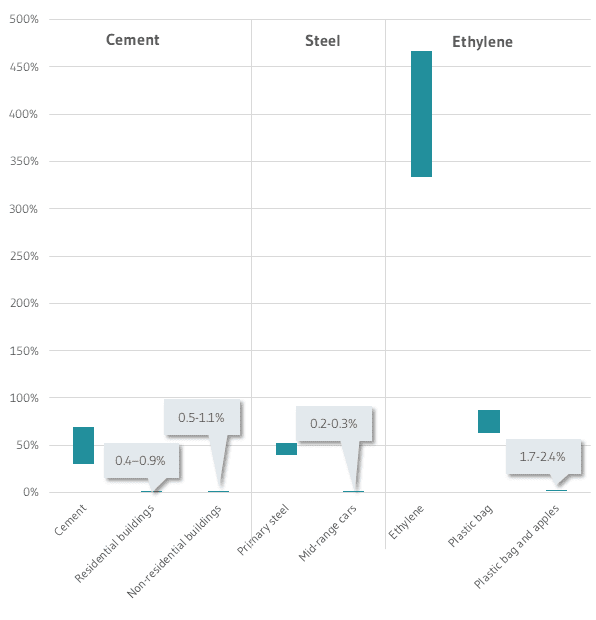 The production of climate-friendly basic materials involves additional costs compared to conventional products. These costs vary in the literature, depending, among other things, on the considered energy prices. The figure below plots these additional costs at the end-product level, assuming full cost roll-over, using Germany as an example. The additional costs at the basic material-level are significant but add very little to the cost of the end products. If additional costs can be passed on to the end products, the cost increase per product will be low, typically around 1%.