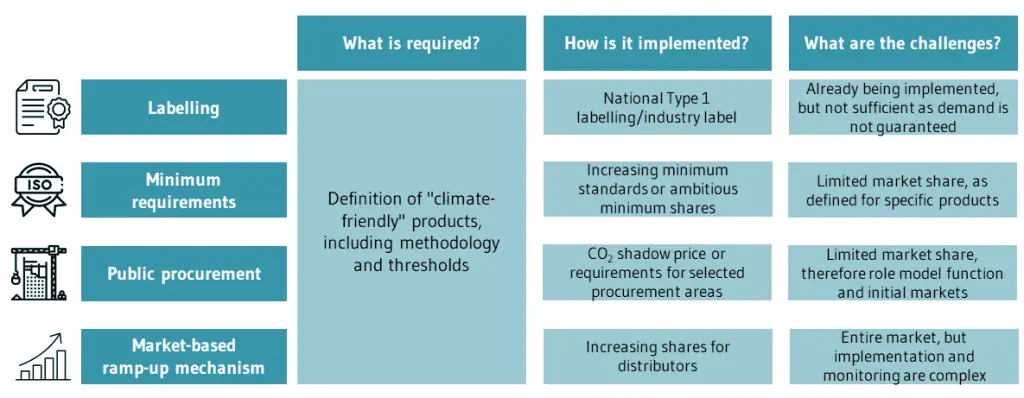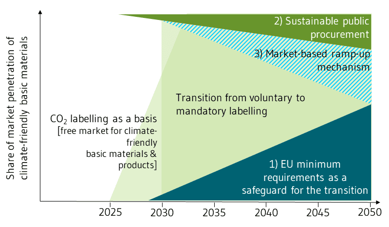 Lead market instruments play different roles over time (see Figure 8). First, labelling is necessary to make the carbon footprint visible. Voluntary agreements are a first step, but they must subsequently become mandatory. Minimum requirements at the European level can provide short-term security, but they only offer incentives for specific product groups. In addition, public procurement can create initial markets in the short term, but these are limited in scope and their relative importance declines over time. In the medium term, a market-based ramp-up mechanism at the European level is one way of generating significant demand. Due to their complementarity, minimum requirements and public procurement can be established in parallel, but earlier than a market-based ramp-up mechanism.