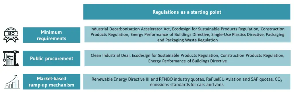 Some existing regulations, especially at the European level, offer a starting point for the creation of lead markets – and in some cases, this is specifically their aim – but this varies depending on the instrument. While there are starting points for minimum requirements or public procurement, for example, new regulations are necessary to introduce a market-based ramp-up mechanism at the European level. These would need to take into account such aspects as tradability, local content criteria, sanctions and flexibility options.