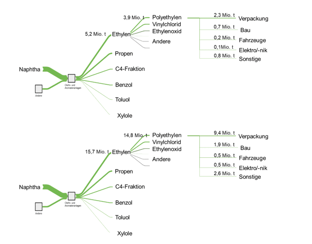 Abbildung 9: Ethylen entlang der Wertschöpfungskette in Deutschland (oben) und der EU (unten) im Jahr 2021. Quelle: eigene Darstellung basierend auf Daten von Plastics Europe 2022; Lindner et al. 2022