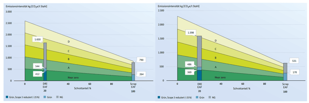 Abbildung 12: Emissionsintensität unterschieden nach Qualitätsstahl (links) und Baustahl (rechts) ent-sprechend des BMWK-Konzepts „Leitmärkte für klimafreundliche Grundstoffe“ (BMWK 2024b), Annahmen und Berechnung sind im wissenschaftlichen Begleitdokument ausführlich dargestellt (Sach et al. 2024). Quelle: BMWK 2024b