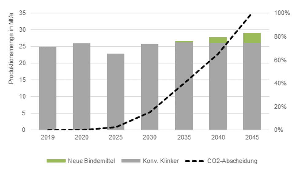 Wie in der untenstehenden Abbildung dargestellt, ist für die Einhaltung der Klimaziele die Abscheidung von CO2 bei der Zement- bzw. Klinkerproduktion notwendig. Folglich ist es kurzfristig nur möglich Leitmarkt-Instrumente für einen vergleichsweise niedrigen Mengenanteil „near zero“ Zement zu definieren, da die Technologien bisher nicht eta-bliert sind. Während das Technologiemix-Szenario hierfür bereits im Jahr 2030 bei rund 20 % der Klinkerproduktion CO2-Abscheidung vorsieht, bleibt dies vor dem Hintergrund der mangelnden Umsetzung zum aktuellen Zeitpunkt fraglich. Auch bei einem geringeren Mengenanteil müsste ein Leitmarkt-Instrument an bestehende Regulierungen anknüpfen, um so kurzfristig etabliert zu werden. Mittelfristig bis 2045 muss die Zement-herstellung jedoch zu 100 % umgestellt werden, um die Zielerreichung zu gewährleisten. Hierfür wäre es dann auch denkbar höhere Mengenanteile im Rahmen eines Leitmarkt-Instruments zu etablieren.