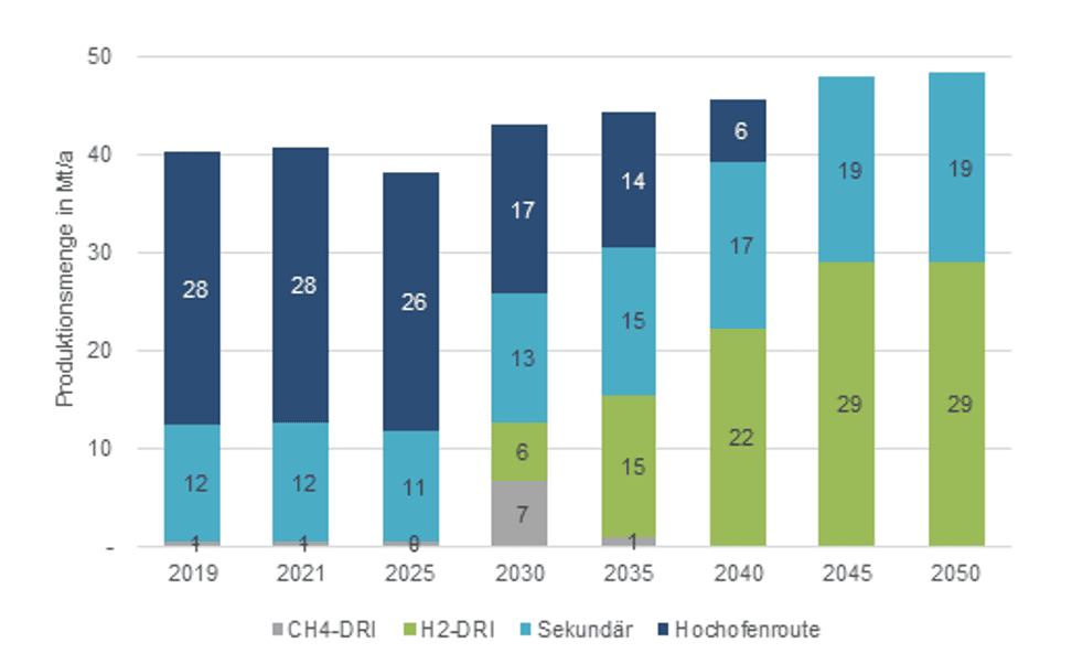 Abbildung 16: Rohstahlproduktion nach Verfahren. Quelle: Luderer et al. 2025