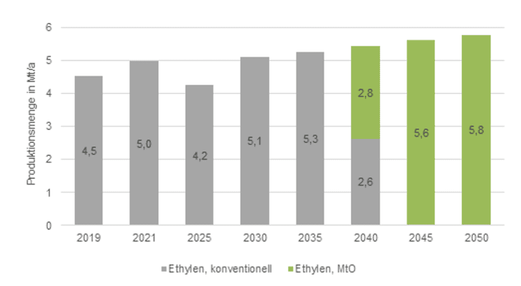 Abbildung 17: Ethylen-Produktion nach Verfahren, MTO exemplarisch als „near zero“-Produktionsroute. Quelle: Luderer et al. 2025