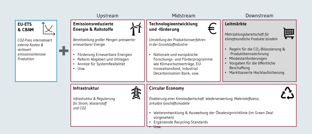 • Leitmärkte, in denen klimafreundliche Grundstoffe aufgrund ihrer Produkteigenschaft trotz höherer Kosten Abnehmer finden, können den bisherigen Instrumentenmix für eine wettbewerbsfähige und klimaneutrale Industrie ergänzen. Es gibt jedoch weiterhin viele offene Fragen hinsichtlich der Ausgestaltung und Umsetzung der konkreten Instrumente für die Steigerung der Nachfrage nach klimafreundlichen Grundstoffen.