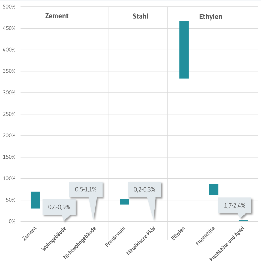 Die Herstellung klimafreundlicher Grundstoffe ist mit Mehrkosten gegenüber den herkömmlichen Herstellungsverfahren verbunden. Diese unterscheiden sich in der Literatur in Abhängigkeit, unter anderem aufgrund der berücksichtigten Energie-preise. Nachfolgend werden diese den Mehrkosten auf Ebene der Endprodukte gegenübergestellt (siehe auch untenstehende Abbildung). Mehrkosten für die Herstellung von Klinker können sich in Abhängigkeit vom gewählten Abscheideverfahren auf 14 € bis 32 € je Tonne Klinker belaufen (Agora Industrie et al. 2022). Dies entspricht einer Steigerung von rund 30 % bis 70 % unter Berücksichtigung von Produktionskosten in Höhe von 46 € je Tonne Zement (Diesing et al. 2025). Für Stahl liegen die Mehrkosten bei rund 150 € bis 200 € je Tonne Rohstahl bei Herstellung von Primärstahl durch die Wasserstoffdirektreduktion in Abhängigkeit vom angenommen Wasserstoffpreis (130 € bis 150 € je Megawattstunde) (Agora Industrie et al. 2021). Die Produktionskosten für die Herstellung von Stahl im Hochofen liegen bei rund 381 € je Tonne Stahl (Diesing et al. 2025), sodass die Mehrkosten für die Wasserstoffdirektreduktion zu einer Steigerung von knapp der Hälfte gegenüber der Referenz führt. Bei der Herstellung von Ethylen fallen die höchsten Mehrkosten an. Fischer und Küper(2021) nehmen beispielsweise rund 3.000 € Mehrkosten je Tonne Olefin über die Methanol-to-Olefins-Route an. Berücksichtigt man aufgrund der hohen Unsicherheit eine Bandbreite von 2.500 € bis 3.500 € je Tonne Olefin, sind die Produktionskosten über drei- bis vier-mal höher (ca. 750 €/t Ethylen) (Moya und Boulamanti 2016). Während die genannten Mehrkosten auf Ebene der Grundstoffe erheblich sind, ist ihr Anteil an den Kosten der Endprodukte gering. Betrachtet man beispielweise den mittleren Einsatz von Zement in Mehrfamilienhäusern mit mindestens drei Wohneinheiten in Deutschland (Gruhler und Deilmann 2017), liegen die Mehrkosten für klimafreundlich produzierten Zement bei rund 1.800 € bis 4.100 € je Gebäude. Dies führt zu einer Kostensteigerung von weniger als einem Prozent (0,4-0,9 %) bei geschätzten Baukosten von rund 475.000 €. Für den mittleren Einsatz von Zement für Nichtwohngebäude in Deutschland liegen die Mehrkosten bei 6.800 € bis 15.000 €. Dies führt wiederum zu Mehrkosten von rund einem Prozent bei geschätzten Baukosten von 1,4 Mio. € (0,5-1,1 %). Der Einsatz von klimafreundlichem Primärstahl in einem Mittelklassefahrzeug (Maurer 2013; Zottler 2014; Wurzer 2016), führt dann zu Mehrkosten von etwa 80 € bis 120 €. Die geschätzten Kosten für ein solches Fahrzeug liegen bei rund 35.000 €, sodass die Mehrkosten lediglich bei rund 0,2 % bis 0,3 % liegen. Während Verpackungen nahezu ausschließlich aus Kunststoff bestehen, sind die absoluten Mehrkosten aufgrund der geringen Materialmenge niedrig. Für eine Plastiktüte (bis 12 kg Tragfähigkeit) werden beispielsweise rund 25 g Polyethylene eingesetzt (Ministry of Environment and Food of Denmark 2018), sodass die Mehrkosten bei rund 6 bis 9 Cent liegen. Bei einem angenommenen Preis von 10 Cent je Tüte führt dies relativ zu rund 60 % bis 90 % höheren Kosten. Jedoch müssen diese Mehrkosten im Kontext der Gesamtkosten inklusive des verpackten Produkts betrachtet werden. Setzt man diese beispielsweise ins Verhältnis zu 2 kg Äpfel mit einem geschätzten Preis von 3,69 €, belaufen sich die Mehrkosten nur auf rund 1,7 % bis 2,4 %. Können Mehrkosten also entlang der Wertschöpfungskette an die Endprodukte weitergegeben werden, ist die Kostensteigerung je Produkt gering und liegt in der Regel bei rund 1 %.