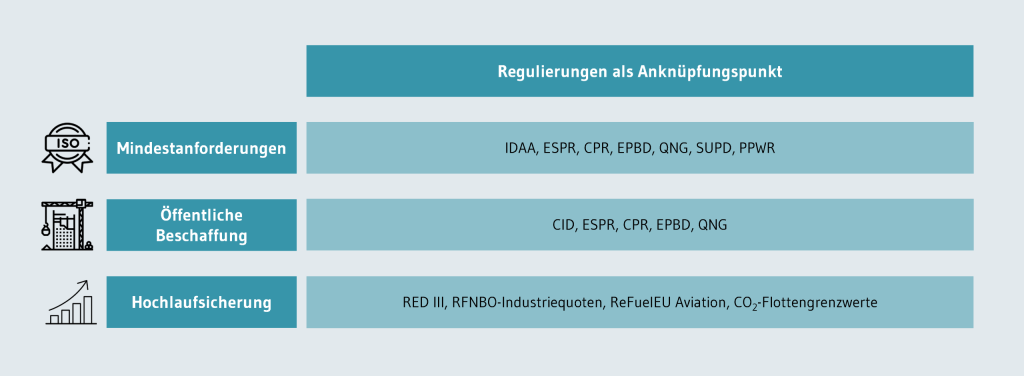 Insbesondere auf europäischer Ebene bieten bestehende Regulierungen Anknüpfungs-punkte zur Schaffung von Leitmärkten bzw. zielen sie in Teilen konkret darauf ab, wie etwa der CID oder der IDAA. Die Möglichkeit der Nutzung der bestehenden Regulierung als Anknüpfungspunkt für Leitmarkt-Instrumente gestaltet sich je nach Instrument unterschiedlich. Während CID, IDDA, ESPR oder die EPBD Anknüpfungspunkte etwa für Mindestanforderungen oder die öffentliche Beschaffung bieten, bedarf es jedoch auch Neuregelungen, um etwa eine marktbasierte Hochlaufsicherung auf Europäischer Ebene einführen zu können.