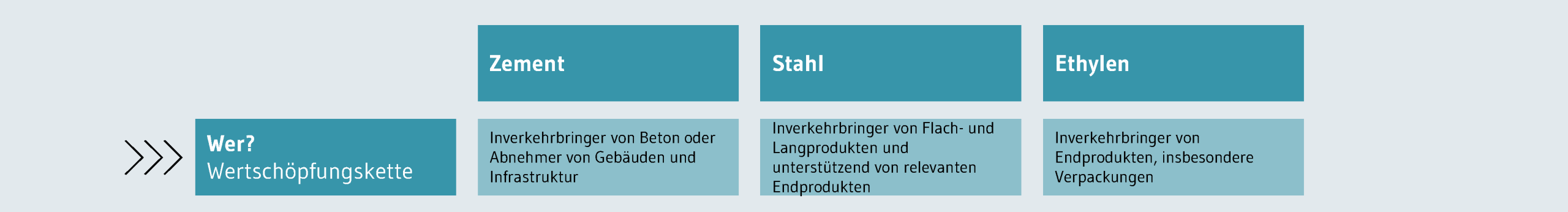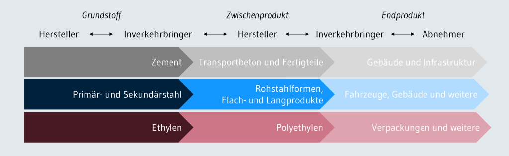 Während Leitmarkt-Instrumente für Grundstoffe einen gezielten Anreiz für die Transformation der Branchen darstellt, kann ein Ansetzen auf den Folgeebenen die Weitergabe der Mehrkosten sicherstellen und weitere Vermeidungsoptionen für die Emissionsreduktion anreizen. Bei detaillierter Betrachtung der ausgewählten Grundstoffe kann keine einheitliche Aussage getroffen werden, welche Ebene der Wertschöpfungskette sich für die Regulierung anbietet. Hierfür spielen unterschiedliche Branchencharakteristika, wie die Diversität von Produkten und Abnehmermärkten, aber auch die Möglichkeiten zur Weitergabe der Mehrkosten sowie Substitution eine wesentliche Rolle. Für Zement sind Leitmarkt-Instrumente sowohl für Inverkehrbringer des Zwischenprodukts Beton und der Inverkehrbringer oder Abnehmer der Endprodukte Gebäude und Infrastruktur denkbar. Aufgrund der vielfältigen Endprodukte von Stahl scheint hier eher die Regulierung der Inverkehrbringer von Zwischenprodukten vielversprechend sowie unterstützende Regulierungen für die Inverkehrbringer besonders relevanter Produkte, wie beispielsweise Gebäude oder PKW. Im Gegensatz zu Zement und Stahl ist die Herstellung von Ethylen mit diversen Substitutionsmöglichkeiten und Wechselwirkungen verknüpft. Am ehesten scheinen Anforderungen für Inverkehrbringer von ausgewählten Endprodukten, insbesondere Verpackungen als größtes Produktsegment, trotz der hohen Komplexität der Abnehmermärkte zielführend.