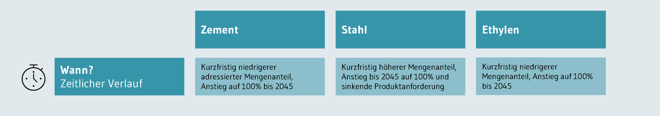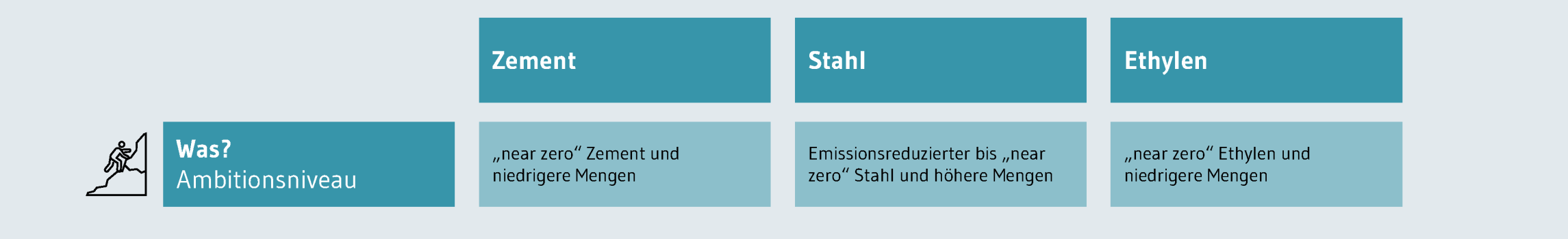 Das Ambitionsniveau ergibt sich aus den Produktanforderungen sowie den zu adressierenden Mengen, welche die notwendige Transformation der Produktionsrouten und Wertschöpfungsketten anreizen können. Es zeigt sich wiederum, dass es kein einheitliches Fazit für alle drei Branchen gibt, da sich die notwendigen Prozessumstellungen grundlegend unterscheiden. Da für die Zielerreichung bei der Zementherstellung die Etablierung von CCS notwendig ist, erscheint die „near zero“-Definition sinnvoll für die Festlegung von Produktanforderungen. Daraus ergibt sich, dass der adressierte Mengenanteil zwar ambitioniert, aber nicht zu hoch sein darf, um eine Erfüllung der Anforderungen sicherzustellen. Dies steht im Gegensatz zur Stahlindustrie, wo auch durch die Definition von emissionsärmerem Stahl eine Umstellung auf neue Stahlherstellungsverfahren – insbesondere Direktreduktion – angereizt werden kann. In diesem Fall kann die geforderte Menge höher sein und im zeitlichen Verlauf kann durch eine Verschärfung der berücksichtigten Emissionsintensität eine Erhöhung des Ambitionsniveaus erreicht werden. Für Ethylen wiederum scheint die „near zero“-Definition zielführend, um neue Produktionsprozesse zu etablieren, welche auch die EOL-Emissionen vermeiden. Nebenprodukte sollten berücksichtigt werden.