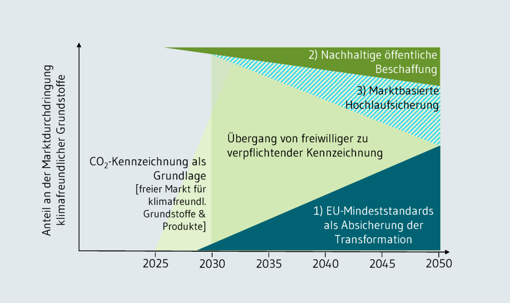 Für die Marktdurchdringung klimafreundlicher Grundstoffe kommt den Instrumenten aus Kapitel 2 im zeitlichen Verlauf bis 2045 eine unterschiedliche Rolle zu (siehe untenstehende Abbildung). Als Grundlage für alle Leitmarkt-Instrumente ist eine Kennzeichnung notwendig, die den CO2-Fußabdruck von Grundstoffen sichtbar macht. Einigungen auf zunächst freiwilliger Basis bedeuten einen ersten Schritt, um CO2-Intensitäten in Kaufentscheidungen miteinbeziehen zu können. Für Stahl und Zement wurden solche Labels bereits mit den jeweiligen Branchen entwickelt, wohingegen eine Kennzeichnung von Ethylen noch fehlt. Auch müssen diese Kennzeichnungen perspektivisch verpflichtend werden. Trotzdem braucht es weitere Instrumente mit längerem Vorlauf, welche über eine Kennzeichnung hinausgehen, um einen Marktrahmen zu etablieren. Mindestanforderungen auf europäischer Ebene können die Industriewende kurzfristig absichern. Jedoch bieten sie nur einen Anreiz für spezifische Produktgruppen und zielen auf die emissionsintensivsten Grundstoffe. Darüber hinaus kann die öffentliche Beschaffung kurzfristig erste Absatzmärkte für klimafreundliche Grundstoffe schaffen, welche jedoch in ihrem Umfang limitiert sind und deren relative Bedeutung im zeitlichen Verlauf abnimmt. Mittelfristig ist vor allem die marktbasierte Hochlaufsicherung auf europäischer Ebene eine Möglichkeit, um eine umfangreiche Nachfrage nach klimafreundlichen Grundstoffen zu generieren. Aufgrund der Komplementarität können Mindestanforderungen und öffentliche Beschaffung parallel, aber früher als die marktbasierte Hochlaufsicherung etabliert werden.