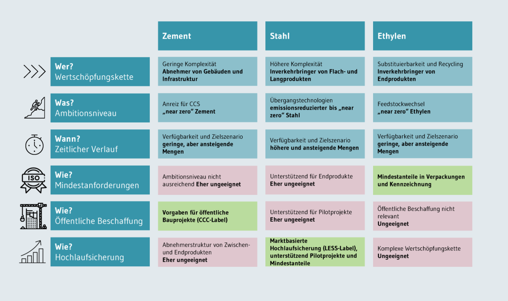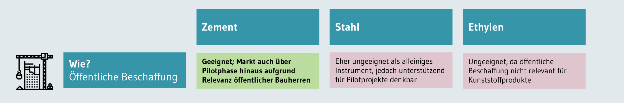 • Für Zement bieten sich aufgrund der homogenen Wertschöpfungskettenstruktur Vorgaben für öffentliche Bauprojekte aufbauend auf dem CCC-Label der Branche an. Das Sondervermögen für Infrastruktur und Klimaneutralität der Bundesregierung könnte die Finanzierung der öffentlichen Bauprojekte sicherstellen.