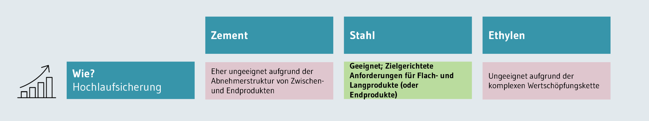 • Für Stahl ist eine marktbasierte Hochlaufsicherung auf europäischer Ebene für Inver-kehrbringer von Flach- und Langprodukten sinnvoll, während die öffentliche Beschaf-fung kurzfristig durch Mindestanteile und Pilotprojekte unterstützend wirken kann.