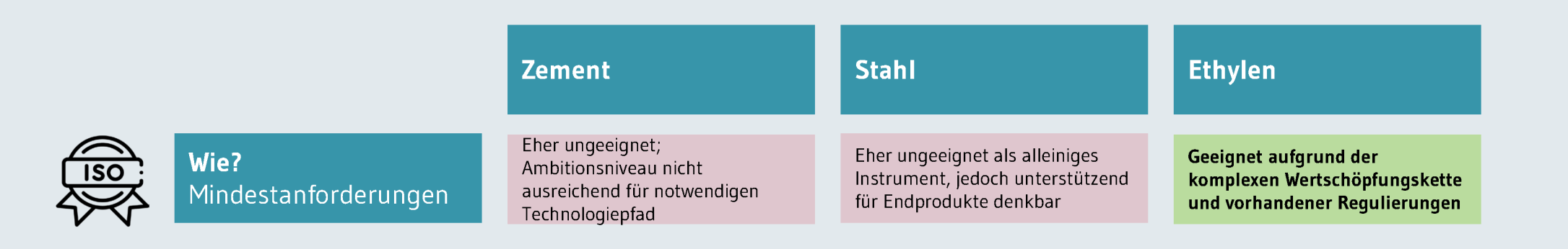 Basierend auf den bestehenden Regulierungen sowie den Erkenntnissen hinsichtlich der Ausgestaltungsparameter werden nachfolgend konkrete Vorschläge zur Umsetzung von Mindestanforderungen, öffentlicher Beschaffung und marktbasierter Hochlaufsicherung für klimafreundlichen Zement, Stahl und Ethylen ausgearbeitet und vergleichend diskutiert. Dabei gilt es zu beachten, dass die Ausgestaltung der Parameter mit den Ansätzen in den Regulierungen übereinstimmen muss. Ein Beispiel: Für Zement ist als Ansatzpunkt entlang der Wertschöpfungskette (siehe Kapitel 3.1) u.a. das Zwischenprodukt zielführend, also Beton, der beispielsweise im Bau weiterverwendet wird. Gleichzeitig deckt die CPR Betonfertigteile ab (siehe Kapitel 2.2). Daher sind Anforderungen für Bauprodukte wie Betonfertigteile durch die Anknüpfung an die CPR möglich.