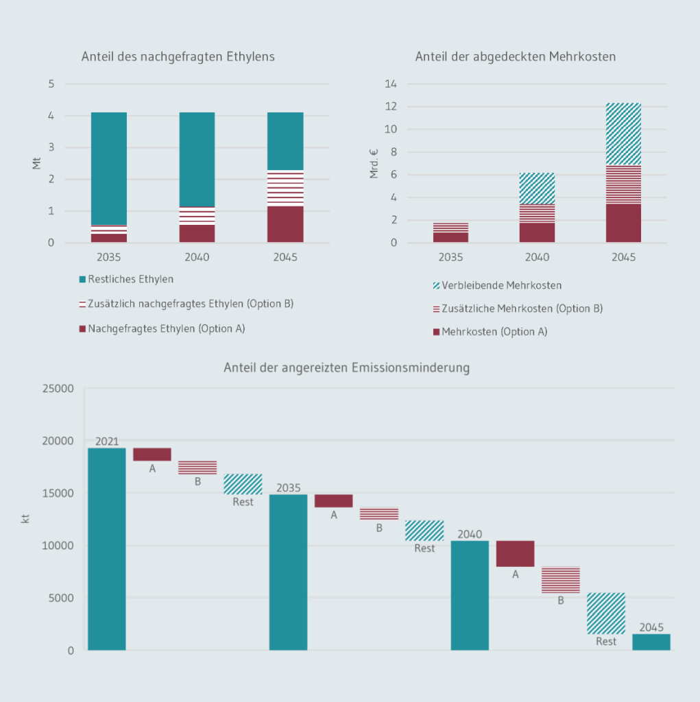 . Hierbei wird angenommen, dass keine Materialsubstitution stattfindet. Untenstehende Abbildung vergleicht zwei Optionen. Option A ist die weniger ambitionierte Option, wobei halb so viel „near zero“-Ethylen im Vergleich zur Option B gefordert wird. Option B orientiert sich ab 2040 am Ariadne-Technologiemix-Szenario mit Mindestanteilen von 50 % bzw. 100 %. Im Jahr 2035 wird entsprechend eines langsam startenden Technologiehochlaufs ein Anteil von 25 % angenommen. Deutlich wird, dass trotz eines relevanten Anreizes für die notwendige Umstellung auf nicht-fossile Feedstocks weitere Instrumente notwendig sind.