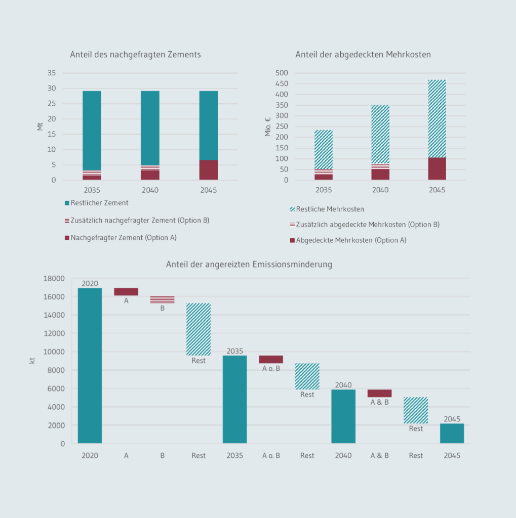 Die nachhaltige öffentliche Beschaffung von Zement kann die Treibhausgasemissionen der Zementherstellung mindern und die Mehrkosten der Prozessumstellung teilweise abdecken. Nachfolgend werden die Potenziale hierfür skizziert. Ausgehend von den Produktionsmengen im Jahr 2020 wird das Potenzial durch den geschätzten Anteil der öffentlichen Beschaffung bestimmt (VDZ 2021; Statistisches Bundesamt 2023, 2025). Hierfür wird einerseits die Emissionsminderung von CCS-Zement gegenüber dem aktuellen Durchschnitt und andererseits die damit in Verbindung stehenden Mehrkosten berücksichtigt (Agora Industrie et al. 2022; BMWK 2024b). Untenstehende Abbildung vergleicht zwei Optionen. Option A geht davon aus, dass zunächst ein geringer Anteil „near zero“-Zement durch die öffentliche Beschaffung abgenommen wird, welcher jedoch bis 2045 auf 100% ansteigt. Option B geht davon aus, dass der Anteil „near zero“Zement bis 2045 linear zunimmt. Im Jahr 2040 ist der zusätzliche Beitrag beider Optionen identisch, im Jahr 2045 ist der angenommene Anteil identisch. Deutlich wird, dass die öffentliche Beschaffung einen relevanten Anteil an der Transformation der Zementindustrie haben kann, obwohl weitere Instrumente notwendig sind, um die vollständige Transformation abzusichern. Hierbei ist es insbesondere relevant auch private Bauherren zu verpflichten.