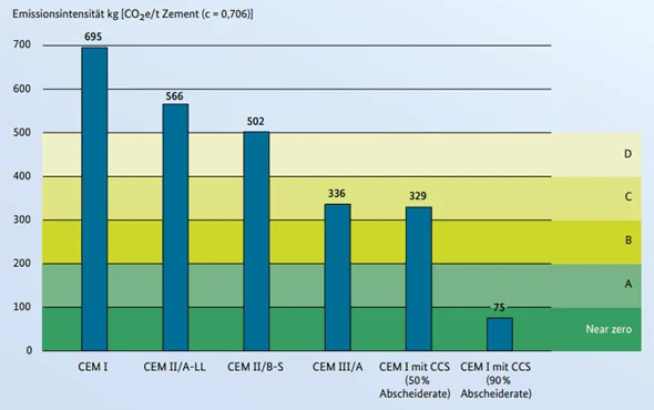 Mit im Mittel 582 kg CO2äq. je Tonne Zement zeichnet sich die Produktion durch hohe energie- und prozessbedingte Treibhausgasemissionen aus, welche im Wesentlichen bei der Herstellung des Vorprodukts Klinker entstehen. Dementsprechend ist einer der wichtigen Hebel zur Senkung der Emissionsintensität von Zement die Reduktion des Klinkerfaktors. In sogenanntem CEM I, welcher für alle Einsatzbereiche genutzt werden kann, wird beinahe ausschließlich Klinker eingesetzt. In anderen Zementtypen werden Klinkersubstitute eingesetzt, beispielsweise der Einsatz von Hochofenschlacke aus der Stahlindustrie in CEM III. Wie in der untenstehenden Abbildung dargestellt, erreicht die Reduktion des Klinkerfaktors teils die Definition für emissionsärmeren Zement, reicht jedoch nicht für die „near zero“-Definition aus. Hierfür ist die Etablierung von CO2-Abscheidung und Speicherung (Carbon Capture and Storage, CCS) notwendig. Anforderungen für emissionsärmeren Zement könnten zwar eine Reduktion gegenüber dem derzeitigen Mittel von rund 246 kg CO2äq. je Tonne Zement bei einer vollständigen Umstellung auf CEM III/A erreichen, würde aber keinen Anreiz für CCS (mit hohen Abscheideraten) schaffen. Für einen solchen Anreiz ist die „near zero“-Definition sinnvoll. Somit könnten gegenüber herkömmlichen CEM I rund 620 kg CO2äq. je Tonne Zement eingespart werden. Jedoch stehen schon heute nennenswerte Mengen von emissionsreduzierten Zementen bereit (rund 55 % des Inlandsversand (VDZ 2021)), „near zero“-Zement ist hingegen derzeit noch nicht verfügbar. Der berücksichtigte Mengenanteil muss dementsprechend niedrig sein und infolge des im nächsten Unterkapitel beschriebenen zeitlichen Verlaufs erhöht werden.