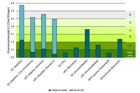 Ethylen ist ein chemisches Produkt, welches hauptsächlich für die Herstellung von Kunststoffen genutzt wird. Ethylen wird bei hohen Temperaturen aus Naphtha, einem Nebenprodukt aus Raffinerien, im Steamcracker gewonnen. Dies ist der energieintensivste Prozessschritt zur Herstellung von Kunststoffen aus Ethylen. Neben Ethylen werden dabei andere Olefine und Aromaten hergestellt, welche ebenfalls für die Produktion von Kunststoffen genutzt werden. Die Energie für den Steamcracker wird heute in Europa in der Regel durch die Verbrennung von Nebenprodukten gewonnen, beispielsweise gemischte Gase (Wasserstoff, Methan, Ethan usw.). Dabei wird fossiler Kohlenstoff in Form von CO2 emittiert. Alternativ kommen eine Vielzahl von Verfahren in Frage, bei welchen die Energie für den Steamcracker klimaneutral gewonnen wird (zum Beispiel mittels Elektrifizierung) oder auch das fossile Naphtha durch andere Feedstocks (Rohmaterialien) ersetzt werden kann. Je nach Verfahren sind dabei mehr oder weniger große Prozessanpassungen nötig. Ethylen kann für die Herstellung verschiedener Produkte genutzt werden, ein Großteil des Ethylens wird jedoch für die Herstellung von Polyethylen-Kunststoffen genutzt. Im Reaktor wird dazu aus Ethylen zunächst Polyethylen als Pulver gewonnen, welches eingeschmolzen und zu Kunststoffprodukten geformt werden kann. Große Teile des Polyethylens werden für die Herstellung von Verpackungen genutzt. Eine Besonderheit ist der im Produkt gebundene Kohlenstoff. Dieser ist elementarer Bestandteil des Ethylens und wird in Form von CO2 frei, wenn die Kunststoffe am Lebensende verbrannt werden, sogenannte End-of-Life-(EOL)-Emissionen. Die dadurch entstehenden Emissionen können die Emissionen der Herstellung deutlich übertreffen.