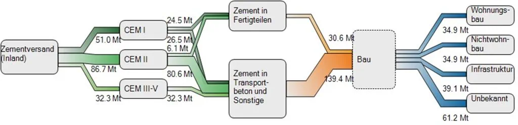 Zement besteht aus Klinker(-substituten) und Additiven. Der Großteil der Treibhaus-gasemissionen entsteht im Brennofen bei der Herstellung von Klinker. Diese sind sowohl energie-, aber auch zu rund zwei Dritteln prozessbedingt (Ishak und Hashim 2015). Der Klinkeranteil im Grundstoff Zement bestimmt nicht nur maßgeblich die Emissionsintensität, sondern auch den Einsatzbereich. Die weiteren Bestandteile des Zements, beispielweise Hüttensand oder Puzzolane, bestimmen die Zementart10Die Hauptart wird nach CEM I bis CEM V unterschieden, eine weitere Unterscheidung erfolgt nach dem Hauptbestandteil neben Klinker, so wird bspw. Portlandhüttenzement mit 6 % bis 20 % (A) Hüttensand (S) als CEM II/A-S bezeichnet (Bosold und Pickhardt 2024). Zusammen mit weiteren Aggregaten und Wasser wird aus Zement das Zwischenprodukt Beton hergestellt, welcher für Gebäude und Infrastruktur eingesetzt wird (Shanks et al. 2019). Diese Endprodukte bestimmen die genannten Anforderungen an die Einsatzbereiche. Beton wird entweder als Transportbeton (Verarbeitung vor Ort) oder als Fertigteil (Lieferung als Bauteile) bereitgestellt.
