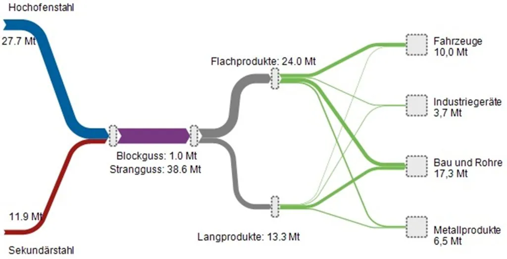 Die emissionsintensive Primärproduktion des Grundstoffs Stahl erfolgt im Hochofen, wo Eisenerz mit Koks zu Roheisen reduziert wird. Verunreinigung werden reguliert und der Kohlenstoffanteil reduziert, um flüssigen Rohstahl bereitzustellen (Cullen et al. 2012). Folglich entstehen sowohl energie- als auch prozessbedingte Emissionen. Die Sekundär-produktion von Stahl erfolgt hingegen aus Schrott im Elektrolichtbogenofen und ist durch eine deutlich geringere Emissions- und Energieintensität charakterisiert (Arens et al. 2017). Der flüssige Stahl wird zu Rohstahlformen (Brammen, Vorblöcken und Knüppel) gegossen, welche wiederum zu diversen Lang- und Flachprodukten11Zu den Langprodukten zählen bspw. Stäbe, Drähte und Profile, während die Flachprodukte im Wesentlichen Bleche unterschiedlicher Dicke und Oberflächenbehandlung umfassenCullen et al. 2012Cullen et al. 2012 weiterverarbeitet werden. Typischerweise werden Langprodukte aus Sekundärstahl und Flachprodukte aufgrund höherer Qualitätsanforderungen aus Primärstahl hergestellt – eine eindeutige Zuordnung ist aber basierend auf statistischen Quellen nicht möglich (VDEh 2015; Pauliuk et al. 2017). Stahl wird in diversen Endprodukten eingesetzt, beispielsweise im Bau, in Fahrzeugen und in Maschinen.