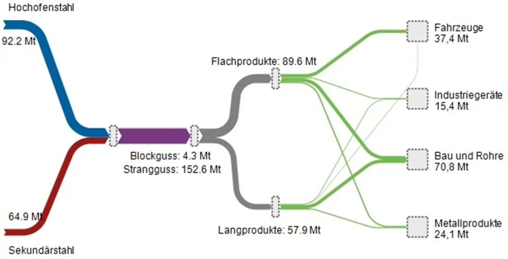 Abbildung 8: Stahl entlang der Wertschöpfungskette in Deutschland (oben) und der EU (unten) im Jahr 2019. Quelle: eigene Darstellung basierend auf Daten von World Steel Association 2022