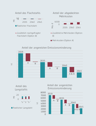 Eine marktbasierte Hochlaufsicherung unterschieden nach Flach- und Langprodukten aus Stahl kann die Treibhausgasemissionen der Stahlherstellung mindern und die Mehr-kosten der Prozessumstellung teilweise abdecken. Ausgehend von den Produktionsmengen im Jahr 2019 werden nachfolgend die Potenziale hierfür skizziert (World Steel Association 2022). Hierfür wird bei Flachstahl die Emissionsminderung der Hochofenroute gegenüber der Direktreduktion mit Erdgas oder Wasserstoff berücksichtigt und für Langstahl eine Emissionsminderung durch einen zunehmenden Anteil von Erneuerbaren Energien (BMWK 2024b). Für die Direktreduktion werden zudem die Mehrkosten berechnet (Agora Industrie et al. 2021). Untenstehende Abbildung zeigt unterschiedliche Optionen für die Ausgestaltung der marktbasierten Hochlaufsicherung. Option A entspricht einem Verlauf leicht unterhalb der Prozessanteile aus dem Ariadne-Technologiemix-Szenario, während Option B annimmt, dass das Ambitionsniveau an diesem Szenario festgelegt wird. Im Jahr 2045 ist der angenommene Verlauf jedoch identisch. Für Flachstahl wird eine Steigerung der Labelklassen startend mit B (2035) über A (2040) bis „near zero“ (2045) und für Langstahl startend mit C (2035) über B (2040) bis A (2045) angenommen. Deutlich wird, dass die marktbasierte Hochlaufsicherung einen wesentlichen Marktanteil und somit einen großen Beitrag zur Transformation der Stahlindustrie haben kann. Je nach Ausgestaltung ist es möglich die gesamte Transformation über ein solches Instrument abzubilden.