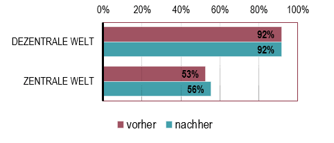 Im direkten Vergleich („forced choice“) zeigt sich, dass die Zustimmung zur dezentralen Welt nach der Deliberation um 5 Prozentpunkte zugenommen hat, während die zentrale Welt 5 Prozentpunkte verlor. Über zwei Drittel der Befragten sprach sich in dieser Befragung für eine Kombination der beiden Welten aus (siehe Kapitel 4).