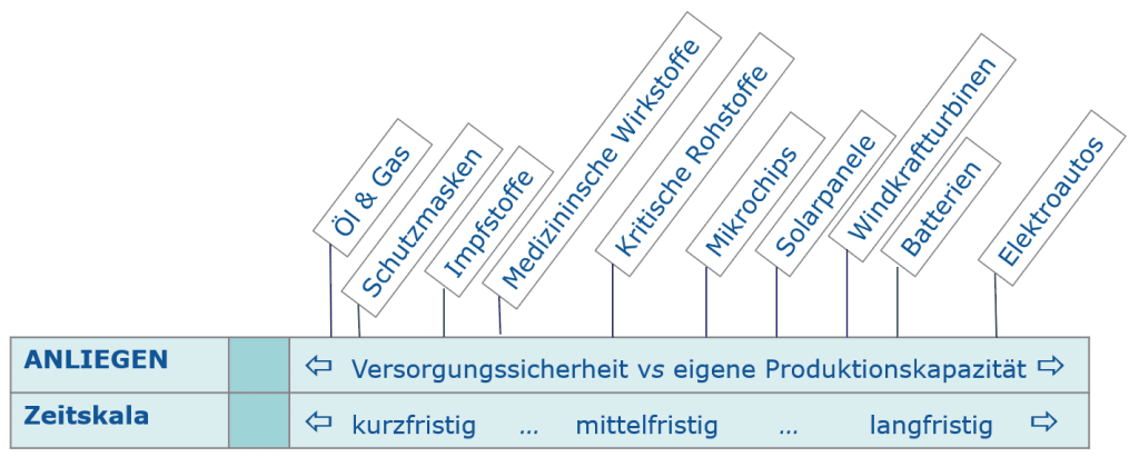 Importabhängigkeit wird in Bezug auf verschiedene Wirtschaftszweige diskutiert, darunter Energieträger (derzeit Öl und Gas, in Zukunft möglicherweise auch grüner Wasserstoff), Pharmaprodukte (Antibiotika, Impfstoffe) und medizinische Geräte (Gesichtsmasken, Beatmungsgeräte), bis hin zu Hightech-Produkte (Mikrochips) und saubere Energiegüter (Solar-PV-Module, Batterien, Elektrofahrzeuge und die damit verbundenen kritischen Rohstoffe). Für jeden dieser Bereiche gibt es spezifische Gründe, warum übermäßige Importe als nachteilig gesehen werden. Dazu gehören die kurzfristige Energiesicherheit im Falle von Gas- und Ölimporten oder die Krisenvorsorge für Medikamente und medizinische Geräte. Die beiden letztgenannten sind kurzfristiger Natur und betreffen vor allem die Versorgungssicherheit, das heißt es spielt eine eher untergeordnete Rolle, von wem und woher diese Güter geliefert werden, solange die Versorgung sichergestellt ist. Anders ist die Situation bei Hightech- und sauberen Energiegütern wie Elektrofahrzeugen oder Batterien, bei denen die kurzfristige Versorgung weniger wichtig ist als die Sicherung der inländischen Produktionskapazitäten, geleitet von mittel- bis langfristigen industriepolitischen Prioritäten bezüglich Wettbewerbsfähigkeit und inländischer Wertschöpfungsketten. Diese verschiedenen Dimensionen der Importabhängigkeit sind in Abbildung 2 dargestellt.