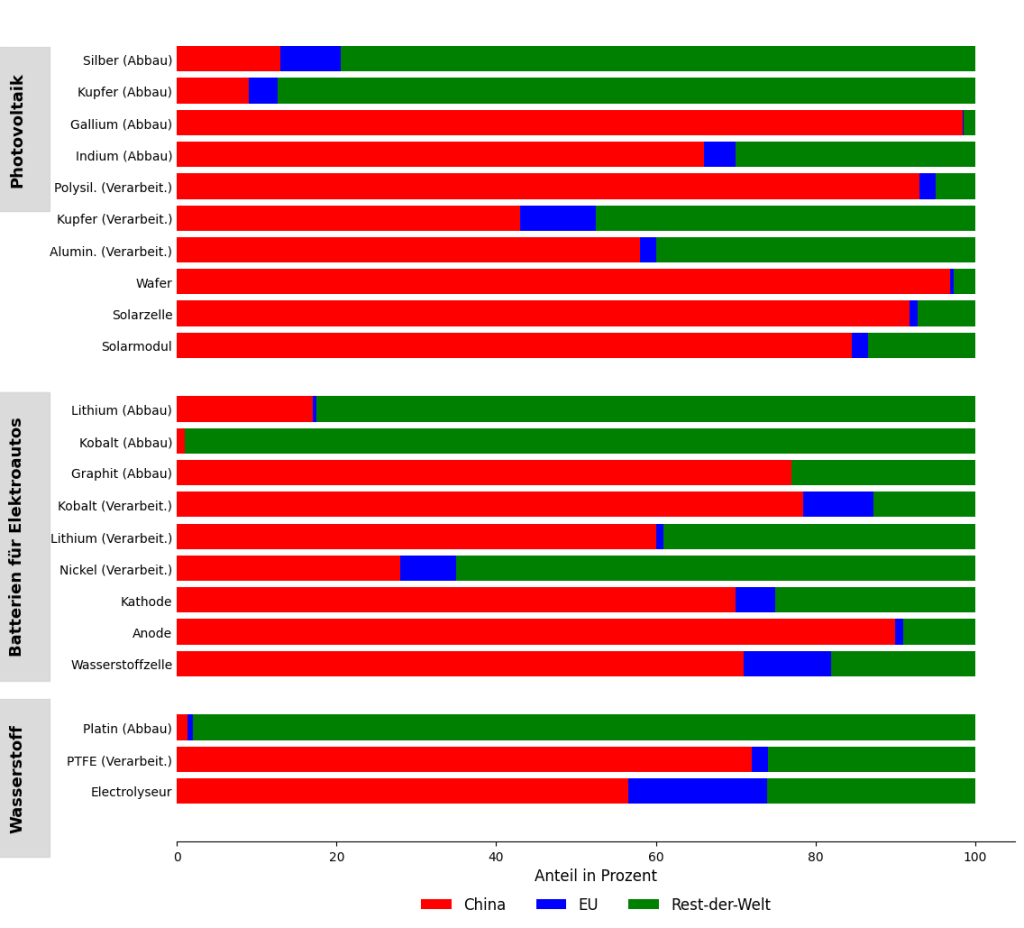 Importabhängigkeit ist ein zentrales Thema in der politischen Diskussion über saubere Energietechnologien und die für deren Herstellung benötigten Rohstoffe. Wir verwenden hier den Begriff saubere Energiegüter als Bezeichnung für diese beiden Kategorien. Saubere Energiegüter sind nicht nur für die Erreichung der internationalen Klimaschutzziele von entscheidender Bedeutung, sondern werden auch zunehmend als wichtiger Faktor für Wirtschaftswachstum und Beschäftigung angesehen. Nach Schätzungen der Internationalen Energieagentur war im Jahr 2023 saubere Energie für 10 % des globalen BIP-Wachstums verantwortlich (IEA 2024a). China nimmt derzeit eine dominante Position in internationalen Lieferketten für Solarmodule, Batterien und Elektrolyseure für Wasserstoff ein (siehe Abbildung 1) und baut auch seinen Anteil am Markt für Elektrofahrzeuge rasch aus. Darüber hinaus erfordern saubere Energietechnologien bestimmte kritische Rohstoffe, bei denen China ebenfalls eine zentrale Rolle spielt und fast den gesamten Weltmarkt für Graphit und Seltene Erden sowie mehr als die Hälfte der Produktion von raffiniertem Lithium und Kobalt kontrolliert (IEA 2022b).