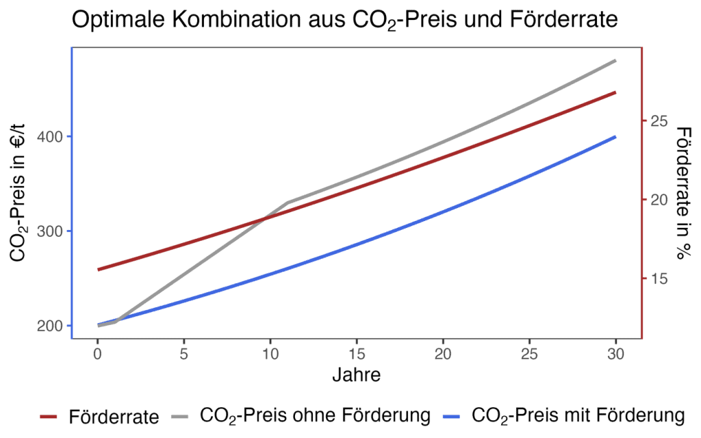 Diese Kosten können durch einen Politikmix aus CO2-Preis und Förderprogrammen reduziert werden. Voraussetzung dafür ist, dass die Förderung nicht dieselbe horizontale Verteilungswirkung aufweist wie die CO2-Bepreisung. Im Idealfall würden Förderprogramme so gewählt, dass Menschen, die die höchste horizontale Belastung durch den CO2-Preis tragen, am stärksten von der Förderung profitieren. Solange die Wohlfahrtsgewinne durch eine Reduktion der horizontalen Verteilungsungleichheit die Effizienzverluste der Förderung übersteigen, lohnt sich somit aus wohlfahrtsökonomischer Sicht eine Kombination beider Instrumente.